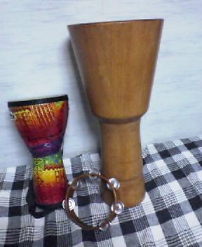 ●茶色は、ジャンベカホン、虹色はフェスティバルジャンベ、どちらも太鼓です。下にあるのはタンバリン、これらが今大事な宝で、毎日ボンタカトン♪と鳴らして楽しんでいます。海や公園で叩くのも気持ちよいですよ!