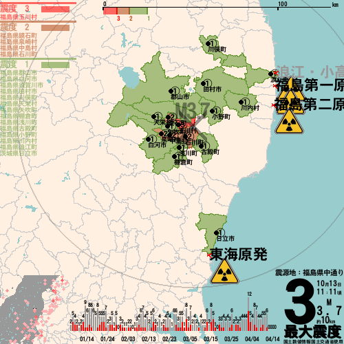 日本の地震の震度情報を、市区町村単位で、地図に描きます。地震は、地盤によって意外な揺れ方をしており、一概に近いほど揺れている訳ではありません。震度3以上の地震はプッシュ通知でお知らせします。津波注意報・津波警報が出ている場合、その旨を文字とともに、海を赤色に描画して警告します。過去の地震も閲覧できます。原子力発電所との位置関係を把握可能。