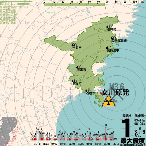 日本の地震の震度情報を、市区町村単位で、地図に描きます。地震は、地盤によって意外な揺れ方をしており、一概に近いほど揺れている訳ではありません。震度3以上の地震はプッシュ通知でお知らせします。津波注意報・津波警報が出ている場合、その旨を文字とともに、海を赤色に描画して警告します。過去の地震も閲覧できます。原子力発電所との位置関係を把握可能。