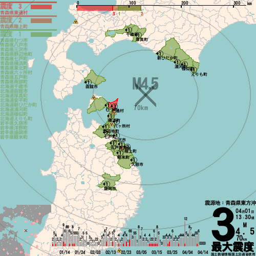 日本の地震の震度情報を、市区町村単位で、地図に描きます。地震は、地盤によって意外な揺れ方をしており、一概に近いほど揺れている訳ではありません。震度3以上の地震はプッシュ通知でお知らせします。津波注意報・津波警報が出ている場合、その旨を文字とともに、海を赤色に描画して警告します。過去の地震も閲覧できます。原子力発電所との位置関係を把握可能。