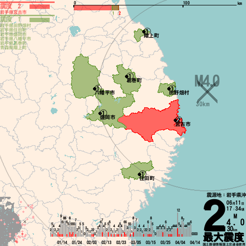 日本の地震の震度情報を、市区町村単位で、地図に描きます。地震は、地盤によって意外な揺れ方をしており、一概に近いほど揺れている訳ではありません。震度3以上の地震はプッシュ通知でお知らせします。津波注意報・津波警報が出ている場合、その旨を文字とともに、海を赤色に描画して警告します。過去の地震も閲覧できます。原子力発電所との位置関係を把握可能。