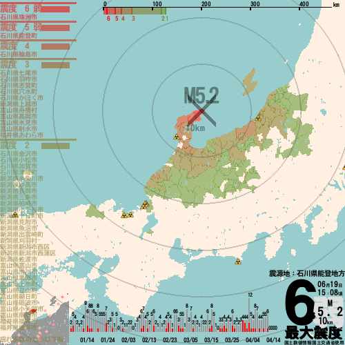 日本の地震の震度情報を、市区町村単位で、地図に描きます。地震は、地盤によって意外な揺れ方をしており、一概に近いほど揺れている訳ではありません。震度3以上の地震はプッシュ通知でお知らせします。津波注意報・津波警報が出ている場合、その旨を文字とともに、海を赤色に描画して警告します。過去の地震も閲覧できます。原子力発電所との位置関係を把握可能。