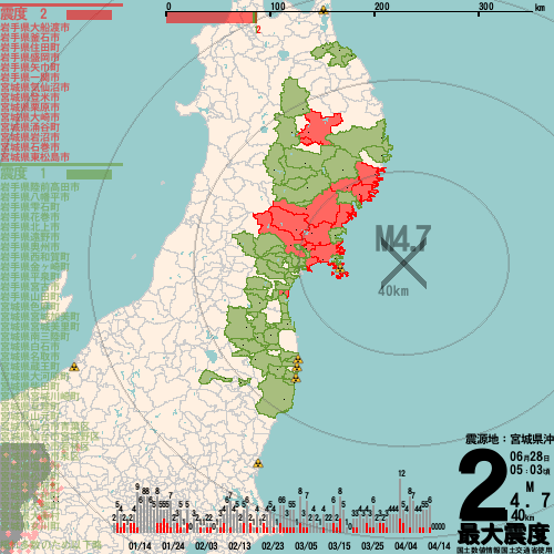 日本の地震の震度情報を、市区町村単位で、地図に描きます。地震は、地盤によって意外な揺れ方をしており、一概に近いほど揺れている訳ではありません。震度3以上の地震はプッシュ通知でお知らせします。津波注意報・津波警報が出ている場合、その旨を文字とともに、海を赤色に描画して警告します。過去の地震も閲覧できます。原子力発電所との位置関係を把握可能。
