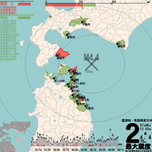 日本で起きた地震を、震度1以上を対象に描画。震度3以上の地震についてはプッシュ通知。津波注意報・津波警報が出ている場合、その旨を文字とともに、海を赤色に描画して警告。過去10回の地震の閲覧。Twitterでのスムーズな情報共有。地図の生成には、気象庁の公開している地震情報と、国土交通省の国土数値情報(県境・湖・役所)およびNaturalEarthの海外地図を利用しています。