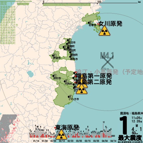 日本の地震の震度情報を、市区町村単位で、地図に描きます。地震は、地盤によって意外な揺れ方をしており、一概に近いほど揺れている訳ではありません。震度3以上の地震はプッシュ通知でお知らせします。津波注意報・津波警報が出ている場合、その旨を文字とともに、海を赤色に描画して警告します。過去の地震も閲覧できます。原子力発電所との位置関係を把握可能。