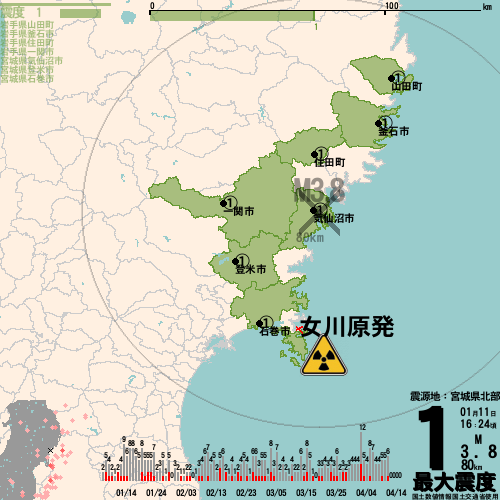 日本の地震の震度情報を、市区町村単位で、地図に描きます。地震は、地盤によって意外な揺れ方をしており、一概に近いほど揺れている訳ではありません。震度3以上の地震はプッシュ通知でお知らせします。津波注意報・津波警報が出ている場合、その旨を文字とともに、海を赤色に描画して警告します。過去の地震も閲覧できます。原子力発電所との位置関係を把握可能。