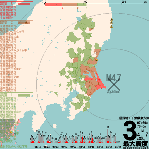 日本の地震の震度情報を、市区町村単位で、地図に描きます。地震は、地盤によって意外な揺れ方をしており、一概に近いほど揺れている訳ではありません。震度3以上の地震はプッシュ通知でお知らせします。津波注意報・津波警報が出ている場合、その旨を文字とともに、海を赤色に描画して警告します。過去の地震も閲覧できます。原子力発電所との位置関係を把握可能。