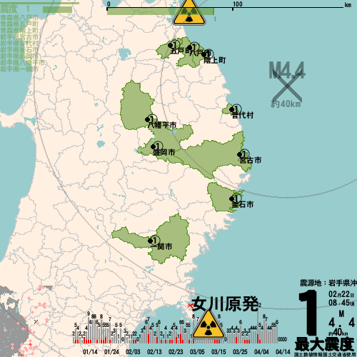 日本の地震の震度情報を、市区町村単位で、地図に描きます。地震は、地盤によって意外な揺れ方をしており、一概に近いほど揺れている訳ではありません。震度3以上の地震はプッシュ通知でお知らせします。津波注意報・津波警報が出ている場合、その旨を文字とともに、海を赤色に描画して警告します。過去の地震も閲覧できます。原子力発電所との位置関係を把握可能。