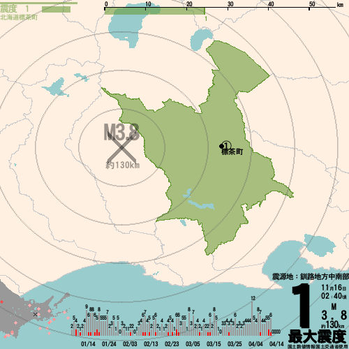 釧路地方中南部_最大震度1_M3.8_約130km