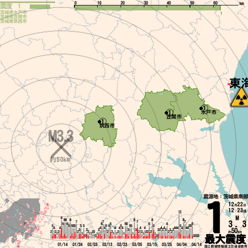 日本の地震の震度情報を、市区町村単位で、地図に描きます。地震は、地盤によって意外な揺れ方をしており、一概に近いほど揺れている訳ではありません。震度3以上の地震はプッシュ通知でお知らせします。津波注意報・津波警報が出ている場合、その旨を文字とともに、海を赤色に描画して警告します。過去の地震も閲覧できます。原子力発電所との位置関係を把握可能。