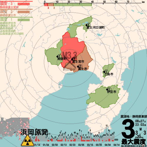 日本の地震の震度情報を、市区町村単位で、地図に描きます。地震は、地盤によって意外な揺れ方をしており、一概に近いほど揺れている訳ではありません。震度3以上の地震はプッシュ通知でお知らせします。津波注意報・津波警報が出ている場合、その旨を文字とともに、海を赤色に描画して警告します。過去の地震も閲覧できます。原子力発電所との位置関係を把握可能。