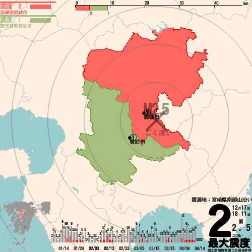 宮崎県南部山沿い_最大震度2_M2.5_約10km未満