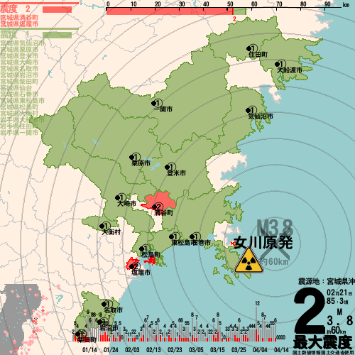 涌谷町,2塩竈市,2気仙沼市,1栗原市,1登米市,1大崎市,1名取市,1岩沼市,1柴田町,1仙台,1石巻市,1東松島市,1松島町,1大衡村,1