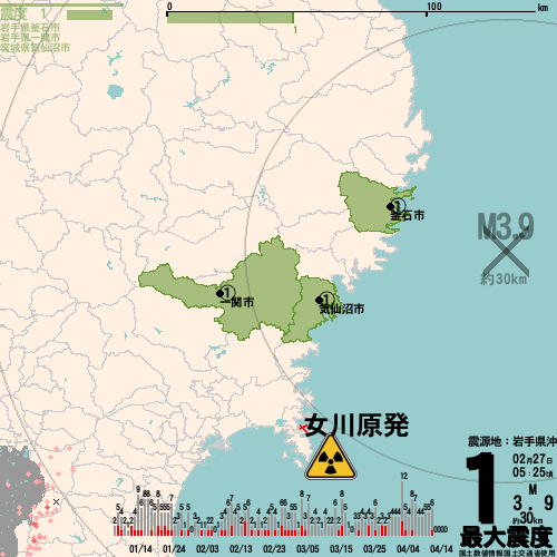 日本の地震の震度情報を、市区町村単位で、地図に描きます。地震は、地盤によって意外な揺れ方をしており、一概に近いほど揺れている訳ではありません。震度3以上の地震はプッシュ通知でお知らせします。津波注意報・津波警報が出ている場合、その旨を文字とともに、海を赤色に描画して警告します。過去の地震も閲覧できます。原子力発電所との位置関係を把握可能。