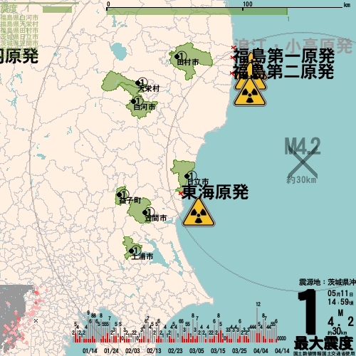 日本の地震の震度情報を、市区町村単位で、地図に描きます。地震は、地盤によって意外な揺れ方をしており、一概に近いほど揺れている訳ではありません。震度3以上の地震はプッシュ通知でお知らせします。津波注意報・津波警報が出ている場合、その旨を文字とともに、海を赤色に描画して警告します。過去の地震も閲覧できます。原子力発電所との位置関係を把握可能。