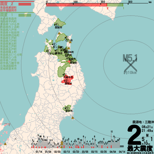 日本で起きた地震を、震度1以上を対象に描画。震度3以上の地震についてはプッシュ通知。津波注意報・津波警報が出ている場合、その旨を文字とともに、海を赤色に描画して警告。過去10回の地震の閲覧。Twitterでのスムーズな情報共有。地図の生成には、気象庁の公開している地震情報と、国土交通省の国土数値情報(県境・湖・役所)およびNaturalEarthの海外地図を利用しています。