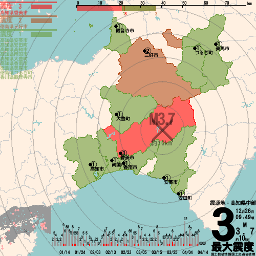 日本の地震の震度情報を、市区町村単位で、地図に描きます。地震は、地盤によって意外な揺れ方をしており、一概に近いほど揺れている訳ではありません。震度3以上の地震はプッシュ通知でお知らせします。津波注意報・津波警報が出ている場合、その旨を文字とともに、海を赤色に描画して警告します。過去の地震も閲覧できます。原子力発電所との位置関係を把握可能。