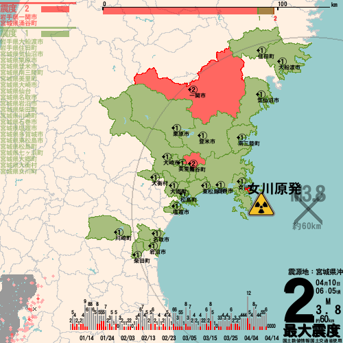 日本の地震の震度情報を、市区町村単位で、地図に描きます。地震は、地盤によって意外な揺れ方をしており、一概に近いほど揺れている訳ではありません。震度3以上の地震はプッシュ通知でお知らせします。津波注意報・津波警報が出ている場合、その旨を文字とともに、海を赤色に描画して警告します。過去の地震も閲覧できます。原子力発電所との位置関係を把握可能。