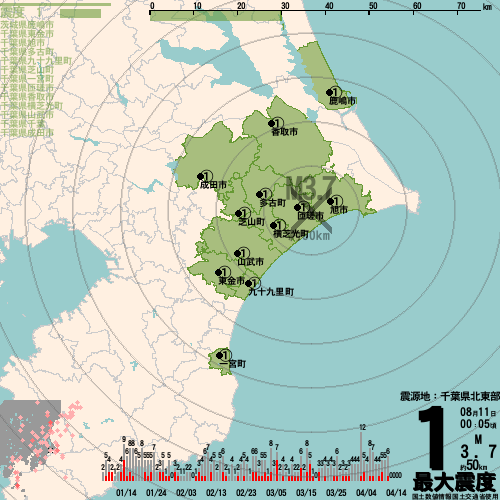日本の地震の震度情報を、市区町村単位で、地図に描きます。地震は、地盤によって意外な揺れ方をしており、一概に近いほど揺れている訳ではありません。震度3以上の地震はプッシュ通知でお知らせします。津波注意報・津波警報が出ている場合、その旨を文字とともに、海を赤色に描画して警告します。過去の地震も閲覧できます。原子力発電所との位置関係を把握可能。