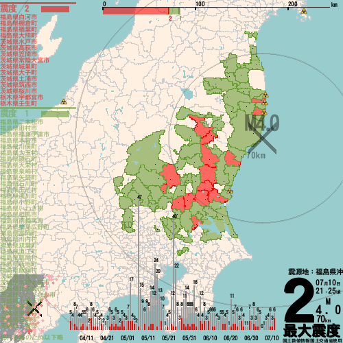 日本の地震の震度情報を、市区町村単位で、地図に描きます。地震は、地盤によって意外な揺れ方をしており、一概に近いほど揺れている訳ではありません。震度3以上の地震はプッシュ通知でお知らせします。津波注意報・津波警報が出ている場合、その旨を文字とともに、海を赤色に描画して警告します。過去の地震も閲覧できます。原子力発電所との位置関係を把握可能。