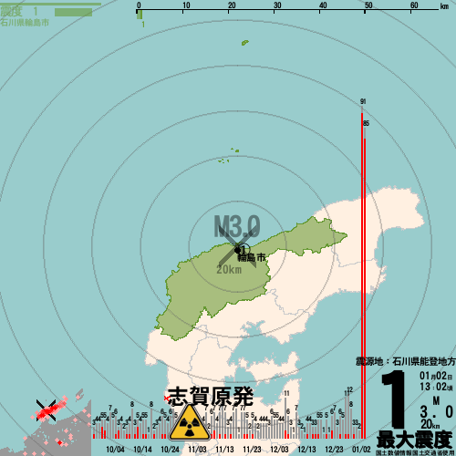 日本の地震の震度情報を、市区町村単位で、地図に描きます。地震は、地盤によって意外な揺れ方をしており、一概に近いほど揺れている訳ではありません。震度3以上の地震はプッシュ通知でお知らせします。津波注意報・津波警報が出ている場合、その旨を文字とともに、海を赤色に描画して警告します。過去の地震も閲覧できます。原子力発電所との位置関係を把握可能。