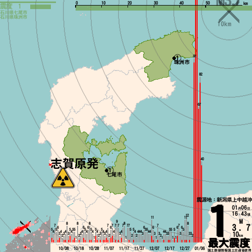 日本の地震の震度情報を、市区町村単位で、地図に描きます。地震は、地盤によって意外な揺れ方をしており、一概に近いほど揺れている訳ではありません。震度3以上の地震はプッシュ通知でお知らせします。津波注意報・津波警報が出ている場合、その旨を文字とともに、海を赤色に描画して警告します。過去の地震も閲覧できます。原子力発電所との位置関係を把握可能。