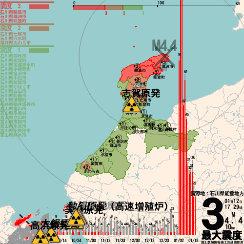 日本の地震の震度情報を、市区町村単位で、地図に描きます。地震は、地盤によって意外な揺れ方をしており、一概に近いほど揺れている訳ではありません。震度3以上の地震はプッシュ通知でお知らせします。津波注意報・津波警報が出ている場合、その旨を文字とともに、海を赤色に描画して警告します。過去の地震も閲覧できます。原子力発電所との位置関係を把握可能。