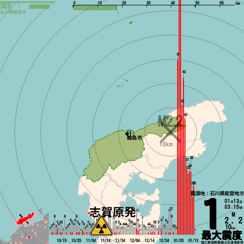 日本の地震の震度情報を、市区町村単位で、地図に描きます。地震は、地盤によって意外な揺れ方をしており、一概に近いほど揺れている訳ではありません。震度3以上の地震はプッシュ通知でお知らせします。津波注意報・津波警報が出ている場合、その旨を文字とともに、海を赤色に描画して警告します。過去の地震も閲覧できます。原子力発電所との位置関係を把握可能。