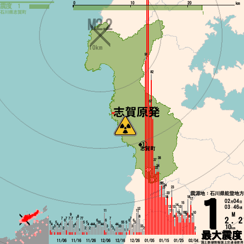 日本の地震の震度情報を、市区町村単位で、地図に描きます。地震は、地盤によって意外な揺れ方をしており、一概に近いほど揺れている訳ではありません。震度3以上の地震はプッシュ通知でお知らせします。津波注意報・津波警報が出ている場合、その旨を文字とともに、海を赤色に描画して警告します。過去の地震も閲覧できます。原子力発電所との位置関係を把握可能。