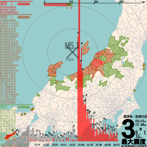 日本の地震の震度情報を、市区町村単位で、地図に描きます。地震は、地盤によって意外な揺れ方をしており、一概に近いほど揺れている訳ではありません。震度3以上の地震はプッシュ通知でお知らせします。津波注意報・津波警報が出ている場合、その旨を文字とともに、海を赤色に描画して警告します。過去の地震も閲覧できます。原子力発電所との位置関係を把握可能。