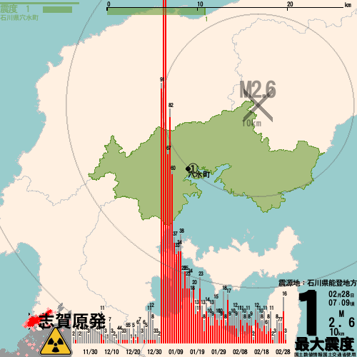 日本の地震の震度情報を、市区町村単位で、地図に描きます。地震は、地盤によって意外な揺れ方をしており、一概に近いほど揺れている訳ではありません。震度3以上の地震はプッシュ通知でお知らせします。津波注意報・津波警報が出ている場合、その旨を文字とともに、海を赤色に描画して警告します。過去の地震も閲覧できます。原子力発電所との位置関係を把握可能。