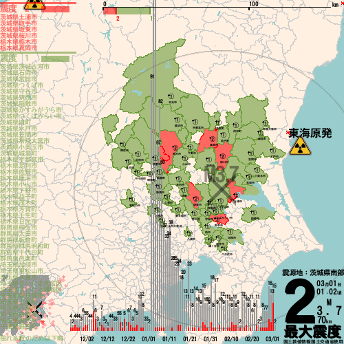 日本の地震の震度情報を、市区町村単位で、地図に描きます。地震は、地盤によって意外な揺れ方をしており、一概に近いほど揺れている訳ではありません。震度3以上の地震はプッシュ通知でお知らせします。津波注意報・津波警報が出ている場合、その旨を文字とともに、海を赤色に描画して警告します。過去の地震も閲覧できます。原子力発電所との位置関係を把握可能。