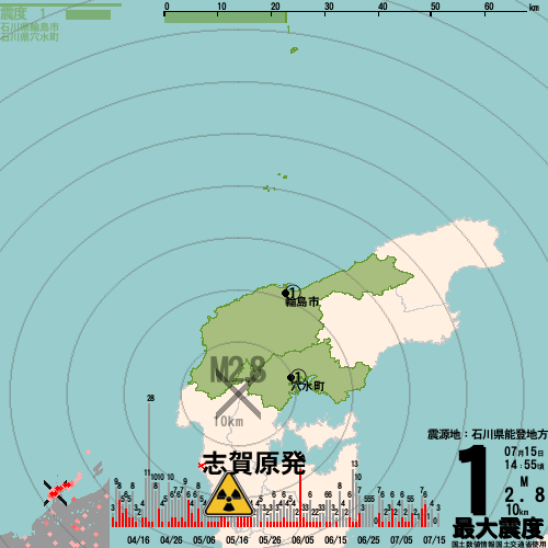 日本の地震の震度情報を、市区町村単位で、地図に描きます。地震は、地盤によって意外な揺れ方をしており、一概に近いほど揺れている訳ではありません。震度3以上の地震はプッシュ通知でお知らせします。津波注意報・津波警報が出ている場合、その旨を文字とともに、海を赤色に描画して警告します。過去の地震も閲覧できます。原子力発電所との位置関係を把握可能。
