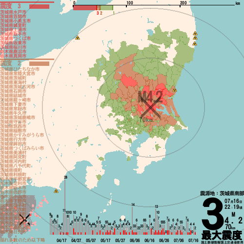 日本の地震の震度情報を、市区町村単位で、地図に描きます。地震は、地盤によって意外な揺れ方をしており、一概に近いほど揺れている訳ではありません。震度3以上の地震はプッシュ通知でお知らせします。津波注意報・津波警報が出ている場合、その旨を文字とともに、海を赤色に描画して警告します。過去の地震も閲覧できます。原子力発電所との位置関係を把握可能。