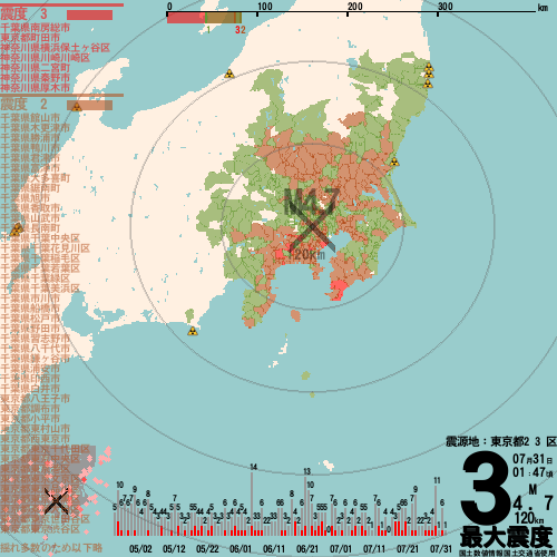日本の地震の震度情報を、市区町村単位で、地図に描きます。地震は、地盤によって意外な揺れ方をしており、一概に近いほど揺れている訳ではありません。震度3以上の地震はプッシュ通知でお知らせします。津波注意報・津波警報が出ている場合、その旨を文字とともに、海を赤色に描画して警告します。過去の地震も閲覧できます。原子力発電所との位置関係を把握可能。