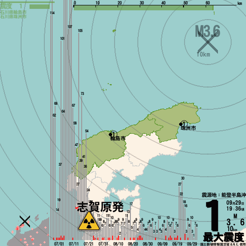 日本の地震の震度情報を、市区町村単位で、地図に描きます。地震は、地盤によって意外な揺れ方をしており、一概に近いほど揺れている訳ではありません。震度3以上の地震はプッシュ通知でお知らせします。津波注意報・津波警報が出ている場合、その旨を文字とともに、海を赤色に描画して警告します。過去の地震も閲覧できます。原子力発電所との位置関係を把握可能。