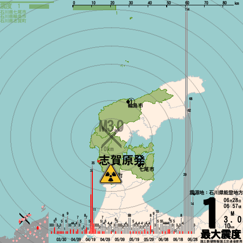 日本の地震の震度情報を、市区町村単位で、地図に描きます。地震は、地盤によって意外な揺れ方をしており、一概に近いほど揺れている訳ではありません。震度3以上の地震はプッシュ通知でお知らせします。津波注意報・津波警報が出ている場合、その旨を文字とともに、海を赤色に描画して警告します。過去の地震も閲覧できます。原子力発電所との位置関係を把握可能。