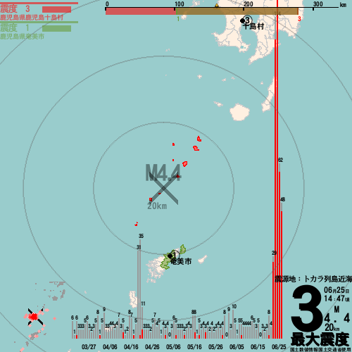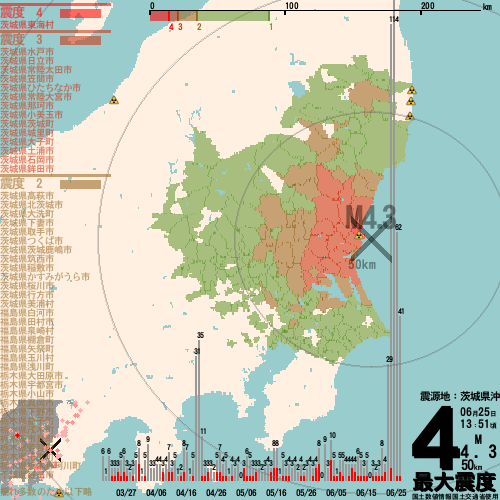 日本の地震の震度情報を、市区町村単位で、地図に描きます。地震は、地盤によって意外な揺れ方をしており、一概に近いほど揺れている訳ではありません。震度3以上の地震はプッシュ通知でお知らせします。津波注意報・津波警報が出ている場合、その旨を文字とともに、海を赤色に描画して警告します。過去の地震も閲覧できます。原子力発電所との位置関係を把握可能。