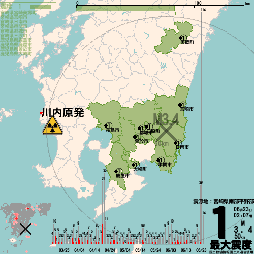 日本の地震の震度情報を、市区町村単位で、地図に描きます。地震は、地盤によって意外な揺れ方をしており、一概に近いほど揺れている訳ではありません。震度3以上の地震はプッシュ通知でお知らせします。津波注意報・津波警報が出ている場合、その旨を文字とともに、海を赤色に描画して警告します。過去の地震も閲覧できます。原子力発電所との位置関係を把握可能。