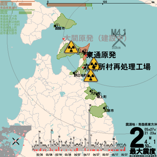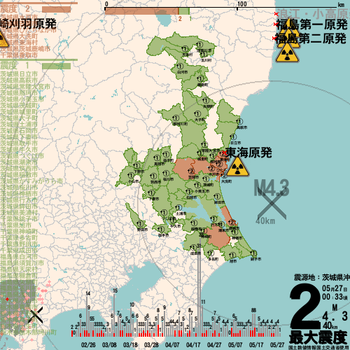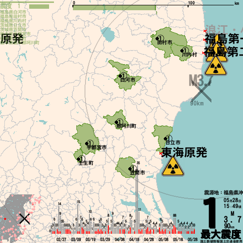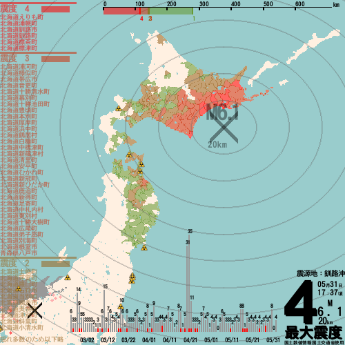日本の地震の震度情報を、市区町村単位で、地図に描きます。地震は、地盤によって意外な揺れ方をしており、一概に近いほど揺れている訳ではありません。震度3以上の地震はプッシュ通知でお知らせします。津波注意報・津波警報が出ている場合、その旨を文字とともに、海を赤色に描画して警告します。過去の地震も閲覧できます。原子力発電所との位置関係を把握可能。
