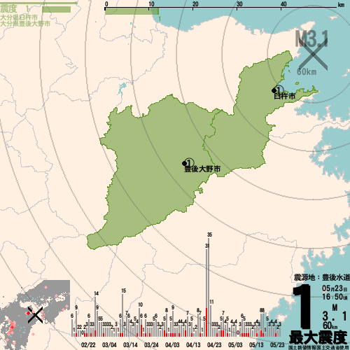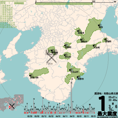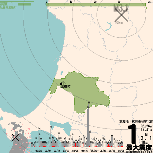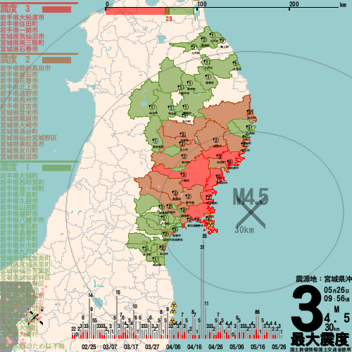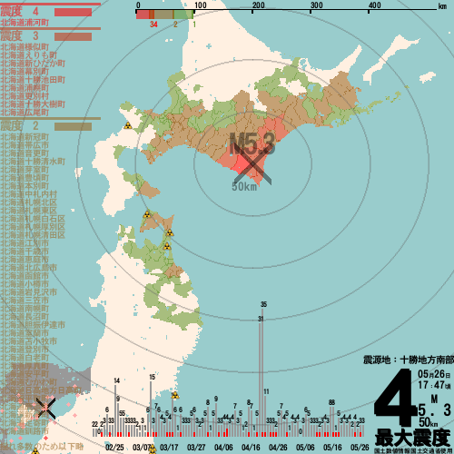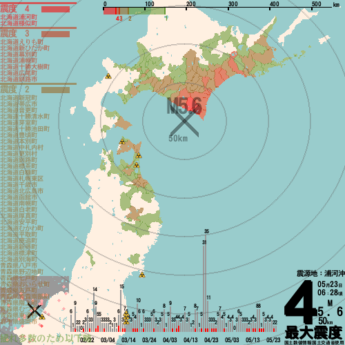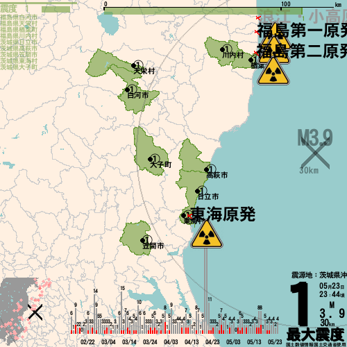 日本の地震の震度情報を、市区町村単位で、地図に描きます。地震は、地盤によって意外な揺れ方をしており、一概に近いほど揺れている訳ではありません。震度3以上の地震はプッシュ通知でお知らせします。津波注意報・津波警報が出ている場合、その旨を文字とともに、海を赤色に描画して警告します。過去の地震も閲覧できます。原子力発電所との位置関係を把握可能。
