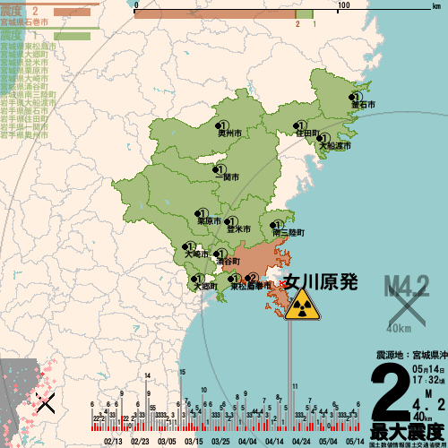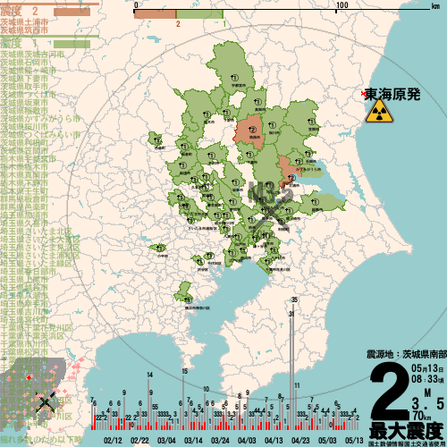 日本の地震の震度情報を、市区町村単位で、地図に描きます。地震は、地盤によって意外な揺れ方をしており、一概に近いほど揺れている訳ではありません。震度3以上の地震はプッシュ通知でお知らせします。津波注意報・津波警報が出ている場合、その旨を文字とともに、海を赤色に描画して警告します。過去の地震も閲覧できます。原子力発電所との位置関係を把握可能。