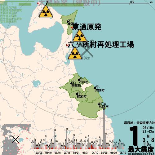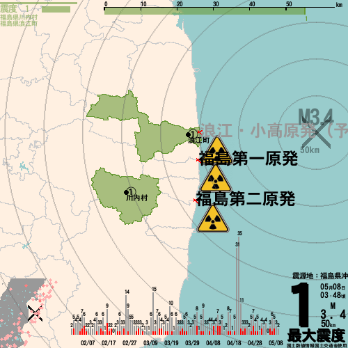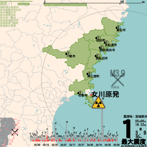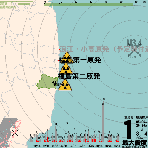 日本の地震の震度情報を、市区町村単位で、地図に描きます。地震は、地盤によって意外な揺れ方をしており、一概に近いほど揺れている訳ではありません。震度3以上の地震はプッシュ通知でお知らせします。津波注意報・津波警報が出ている場合、その旨を文字とともに、海を赤色に描画して警告します。過去の地震も閲覧できます。原子力発電所との位置関係を把握可能。