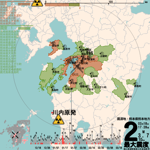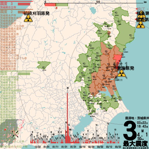 日本の地震の震度情報を、市区町村単位で、地図に描きます。地震は、地盤によって意外な揺れ方をしており、一概に近いほど揺れている訳ではありません。震度3以上の地震はプッシュ通知でお知らせします。津波注意報・津波警報が出ている場合、その旨を文字とともに、海を赤色に描画して警告します。過去の地震も閲覧できます。原子力発電所との位置関係を把握可能。