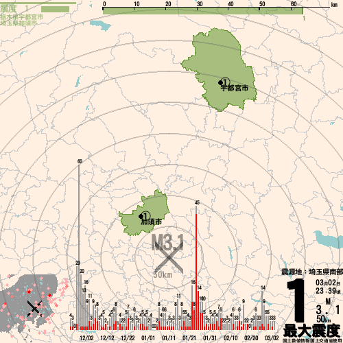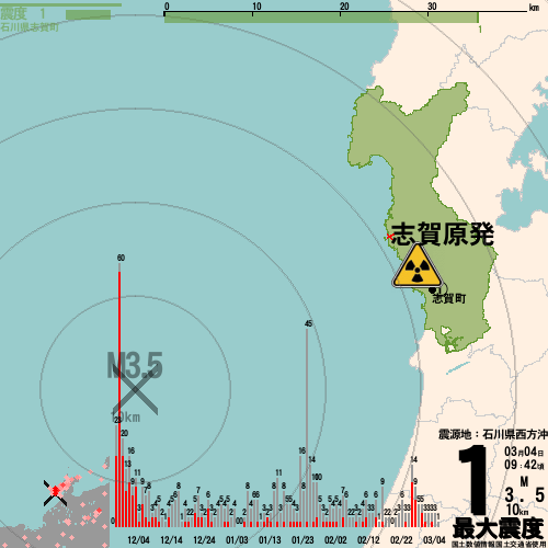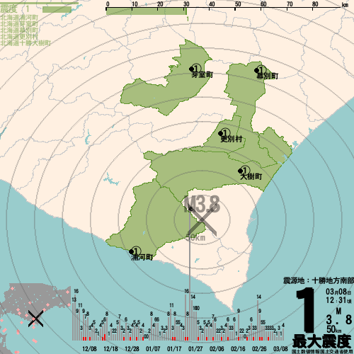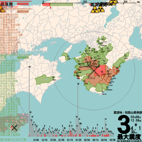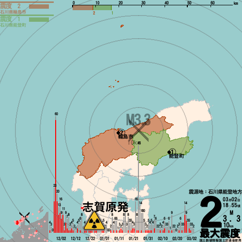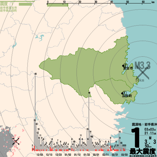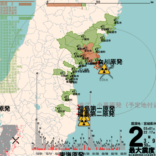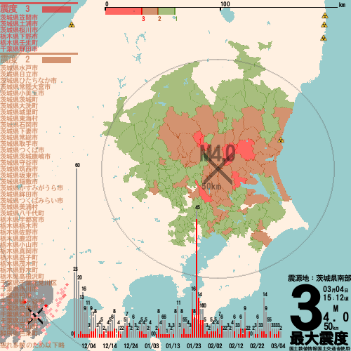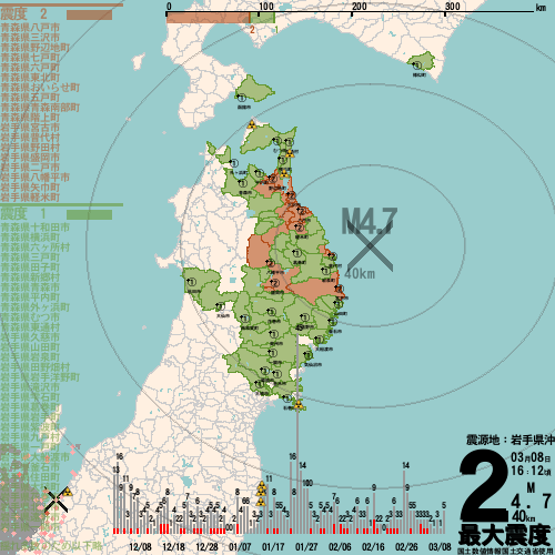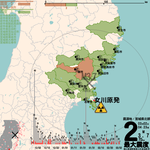 日本の地震の震度情報を、市区町村単位で、地図に描きます。地震は、地盤によって意外な揺れ方をしており、一概に近いほど揺れている訳ではありません。震度3以上の地震はプッシュ通知でお知らせします。津波注意報・津波警報が出ている場合、その旨を文字とともに、海を赤色に描画して警告します。過去の地震も閲覧できます。原子力発電所との位置関係を把握可能。