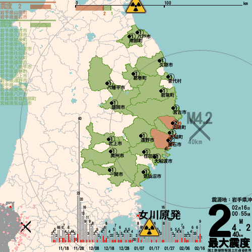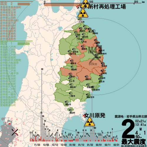 日本の地震の震度情報を、市区町村単位で、地図に描きます。地震は、地盤によって意外な揺れ方をしており、一概に近いほど揺れている訳ではありません。震度3以上の地震はプッシュ通知でお知らせします。津波注意報・津波警報が出ている場合、その旨を文字とともに、海を赤色に描画して警告します。過去の地震も閲覧できます。原子力発電所との位置関係を把握可能。