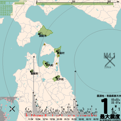 日本で起きた地震を、震度1以上を対象に描画。震度3以上の地震についてはプッシュ通知。津波注意報・津波警報が出ている場合、その旨を文字とともに、海を赤色に描画して警告。過去10回の地震の閲覧。Twitterでのスムーズな情報共有。地図の生成には、気象庁の公開している地震情報と、国土交通省の国土数値情報(行政区域・湖沼・市区町村役場)を利用しています。
