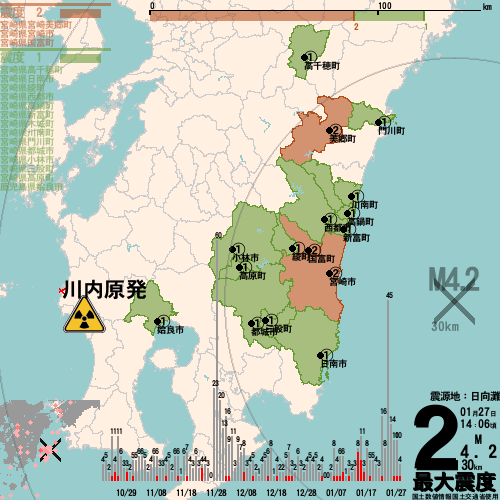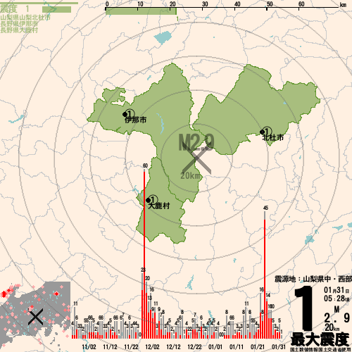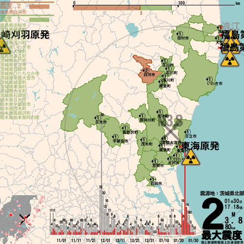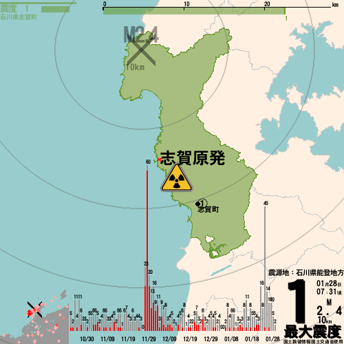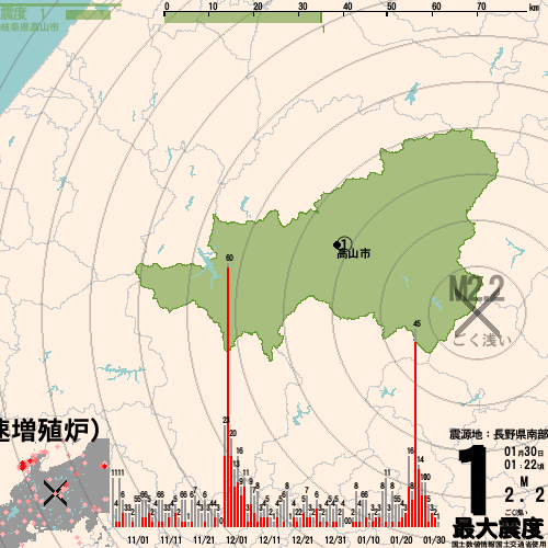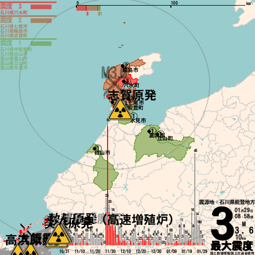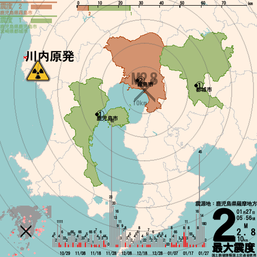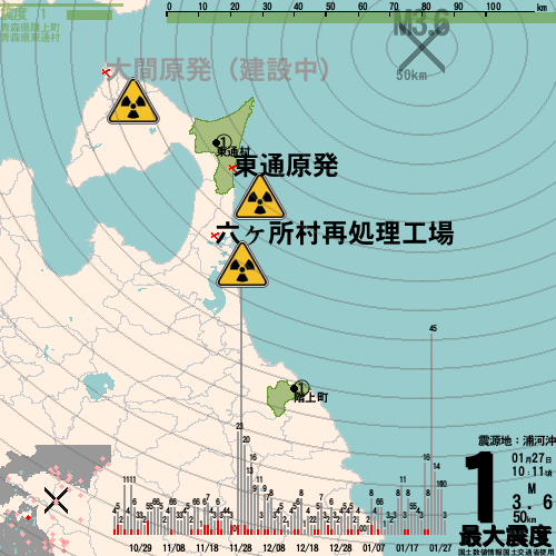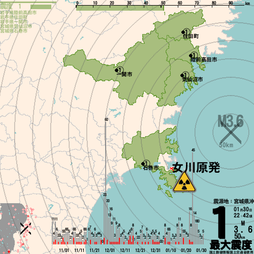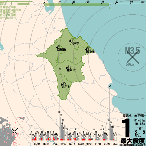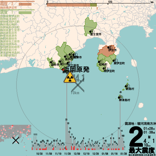 日本の地震の震度情報を、市区町村単位で、地図に描きます。地震は、地盤によって意外な揺れ方をしており、一概に近いほど揺れている訳ではありません。震度3以上の地震はプッシュ通知でお知らせします。津波注意報・津波警報が出ている場合、その旨を文字とともに、海を赤色に描画して警告します。過去の地震も閲覧できます。原子力発電所との位置関係を把握可能。