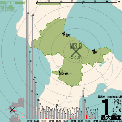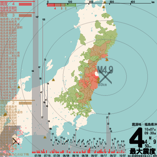 日本の地震の震度情報を、市区町村単位で、地図に描きます。地震は、地盤によって意外な揺れ方をしており、一概に近いほど揺れている訳ではありません。震度3以上の地震はプッシュ通知でお知らせします。津波注意報・津波警報が出ている場合、その旨を文字とともに、海を赤色に描画して警告します。過去の地震も閲覧できます。原子力発電所との位置関係を把握可能。