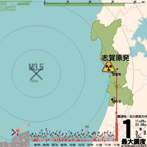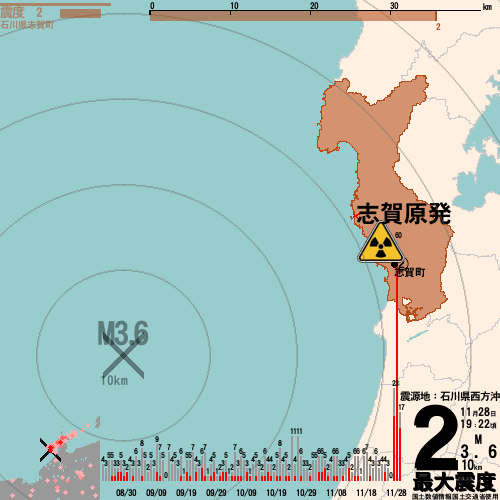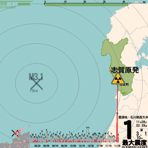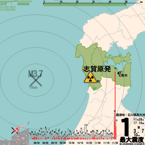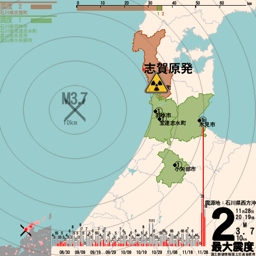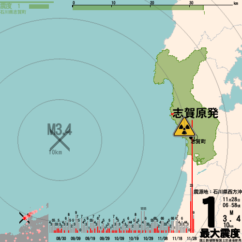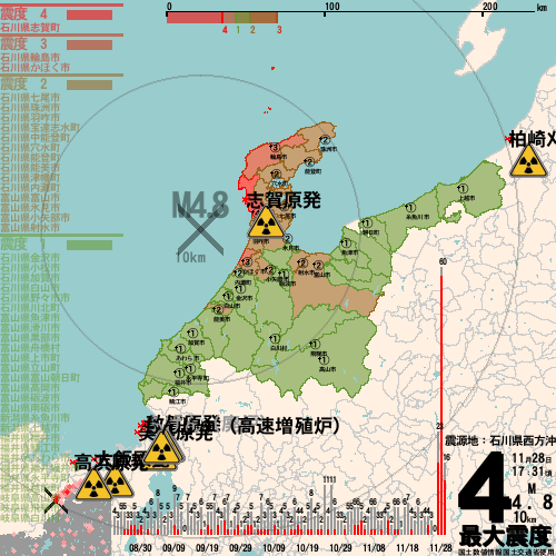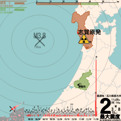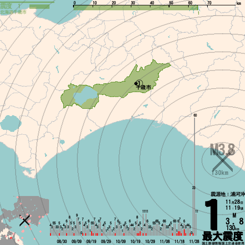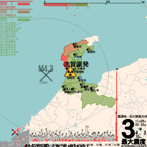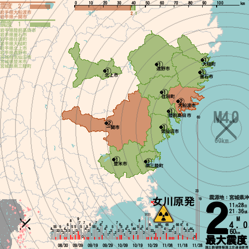 日本の地震の震度情報を、市区町村単位で、地図に描きます。地震は、地盤によって意外な揺れ方をしており、一概に近いほど揺れている訳ではありません。震度3以上の地震はプッシュ通知でお知らせします。津波注意報・津波警報が出ている場合、その旨を文字とともに、海を赤色に描画して警告します。過去の地震も閲覧できます。原子力発電所との位置関係を把握可能。